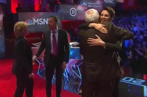 Here’s something you don’t see everyday: MSNBC host and debate moderator Rachel Maddow took to the stage after the debate Thursday night to personally hug the candidates.As is her wont, Maddow used a red herring as an excuse for her hugs, saying that she'd do the same for Republicans if they ever did a debate on MSNBC. But the whole planet knows that with Maddow's well-known uber-Left, pro-gay politics that that will never happen. Bottom line, the hugs were just wrong and unprofessional and Maddow, who most likely wants Hillary to win the Dem nom because she's a woman (but is having a hard time getting past the fact that Sanders is clearly the most 'progressive' of the two), hugged them both because she could live with either one winning the White House...as long as they win. And dammit one of them better win, right Rachel?